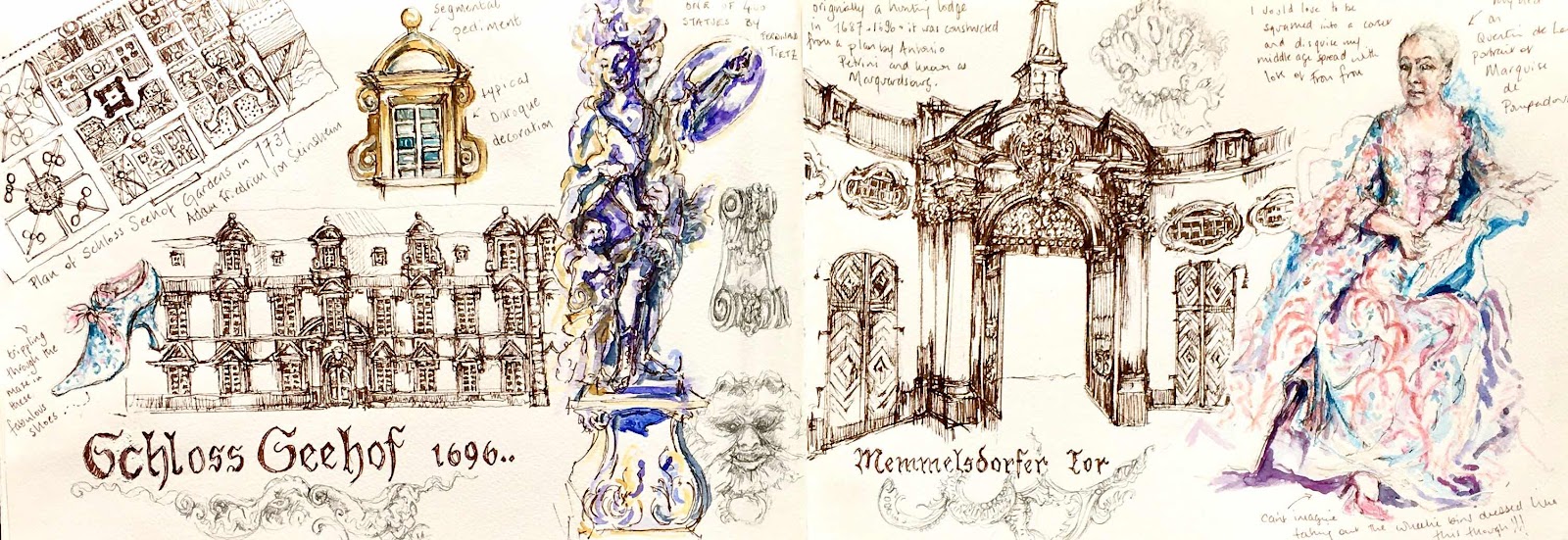 So let’s take a closer peek, on the left top hand corner you can see a plan of the Rococo garden in 1731, with decorative gardens, a hedge theatre and labyrinth, it was in these gardens that the statues were placed. The figure featured in my sketch is Athena I believe. Although there are few of the statues left, Ferdinand Tietz' themes for the garden are known, mythological figures, allegorical themes relating to the four seasons and religion of course played a role as this was the summer residence of the Bamberg prince bishops. In the Orangerie there is a wee Ferdinand Tietz museum and parts of the garden remain but certainly not to the extent of what is shown in the plan.
