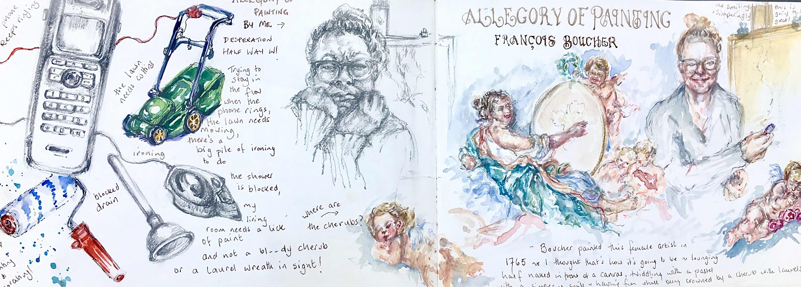 I've started so I'll finish! The famous words of Magnus Magnusson in the famous TV series Mastermind and this sketchbook page was masterminded long ago and then disappeared among the depths of my sketchbook. Inspired by François Boucher's The Allegory of Painting!