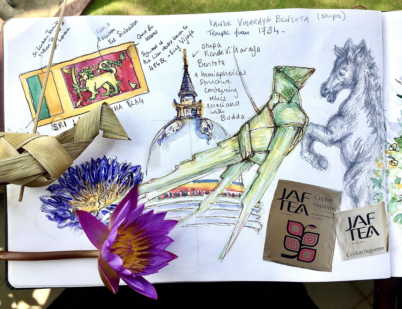 First up though, the weather was fabulous and Sri Lanka offers a myriad of sights to see! My sketchbook page shows the stupa of the Kande Viharaya temple in Bentota, spectacular but an impromptu stop here on our way to buy drinks meant I didn’t have my mobile with me to take snaps!